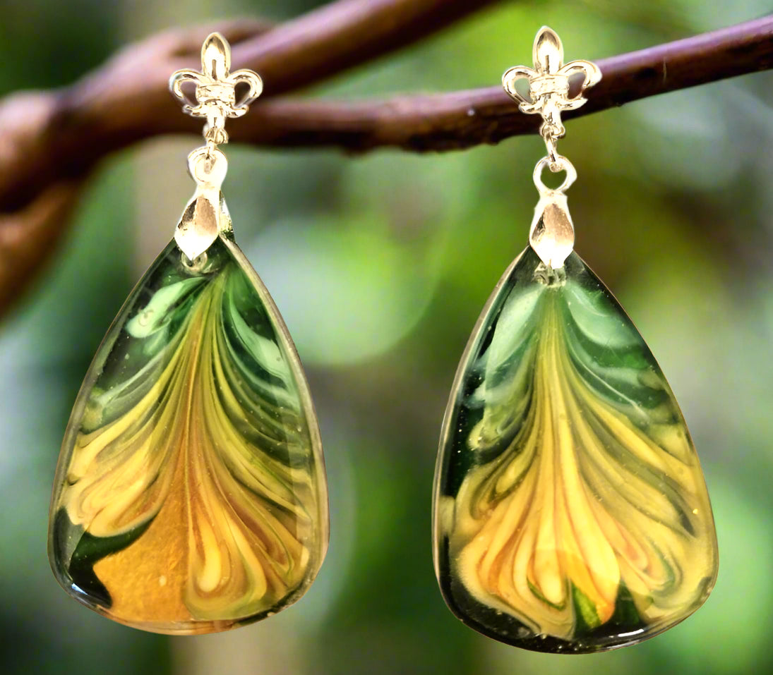 LIME SORBETSwirled in vibrant tones of green and golden citrus, these handcrafted resin earrings bring a touch of brightness to any look.