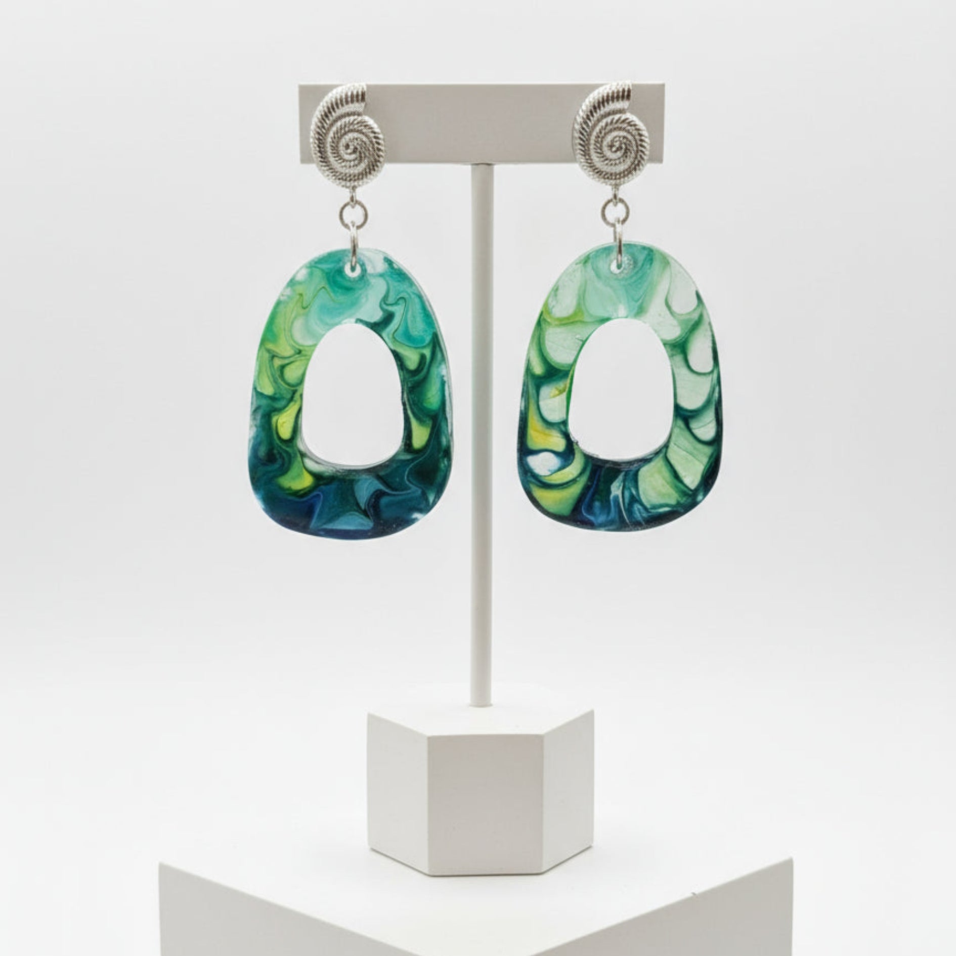 Inspired by the quiet beauty of flowing water, Streamlight earrings feature softly marbled resin loops in hues of riverstone, mist, and mineral blue.